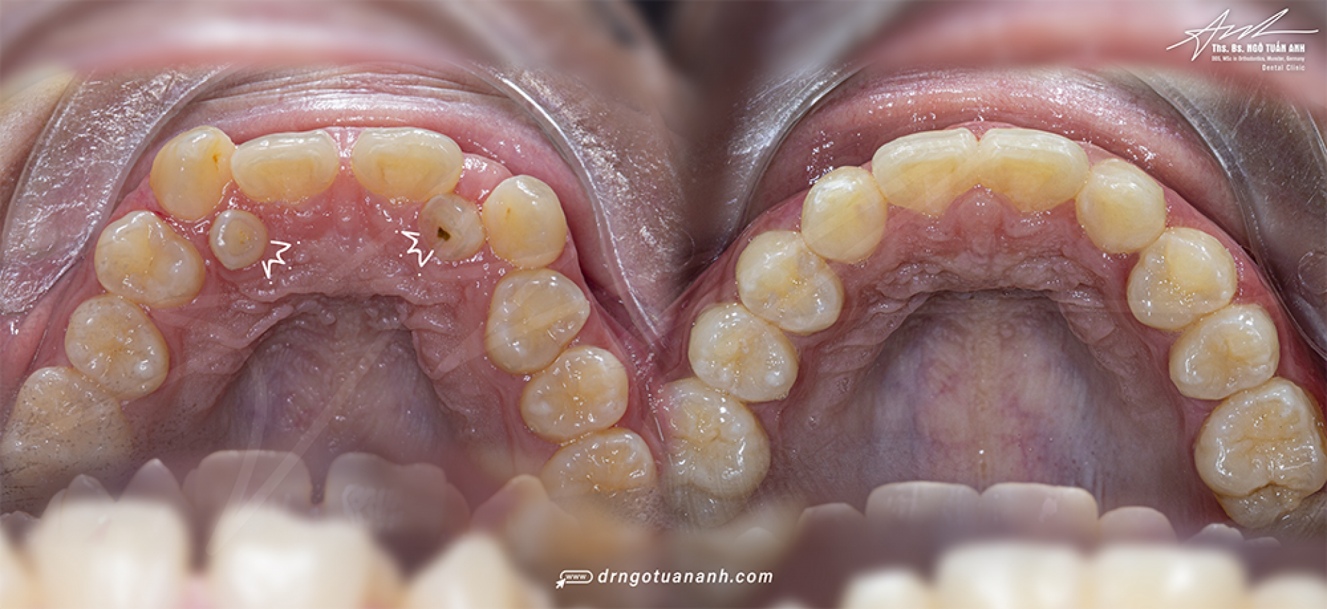 Hình ảnh một ca điều trị với tình trạng thiếu bẩm sinh 2 răng cửa bên, được chỉ định nhổ 2 răng sữa còn sót và chỉnh nha sắp đều cung răng, dùng răng nanh thay thế răng cửa.